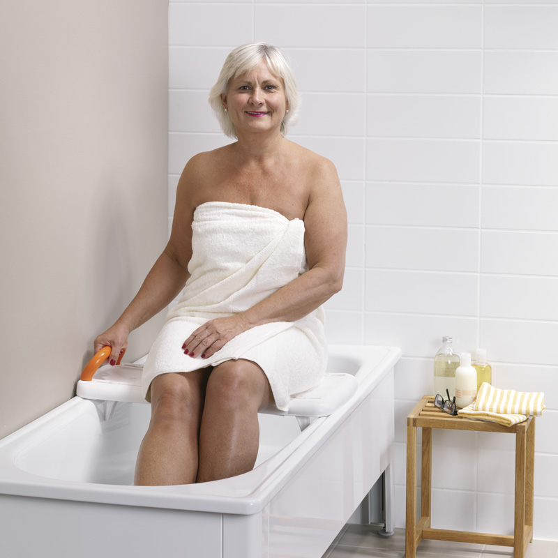 Tabla de bañera Fresh con asa en color anaranjado y largo total 69 cm. La tabla nos ayuda a entrar y salir de la bañera fácilmente y con seguridad, sentándonos en el borde por la parte más ancha podemos cogernos del asa que quedará en el interior y ya sentados podremos introducir primero una pierna y luego la otra, la tabla se ha diseñado con una parte algo más estrecha para que sea más fácil la higiene íntima.